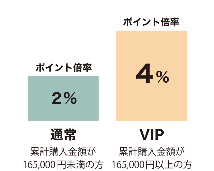 累計165,000円(税込)以上ご購入いただいた方はVIP会員となり、もれなくポイントの付与率が2倍になります。