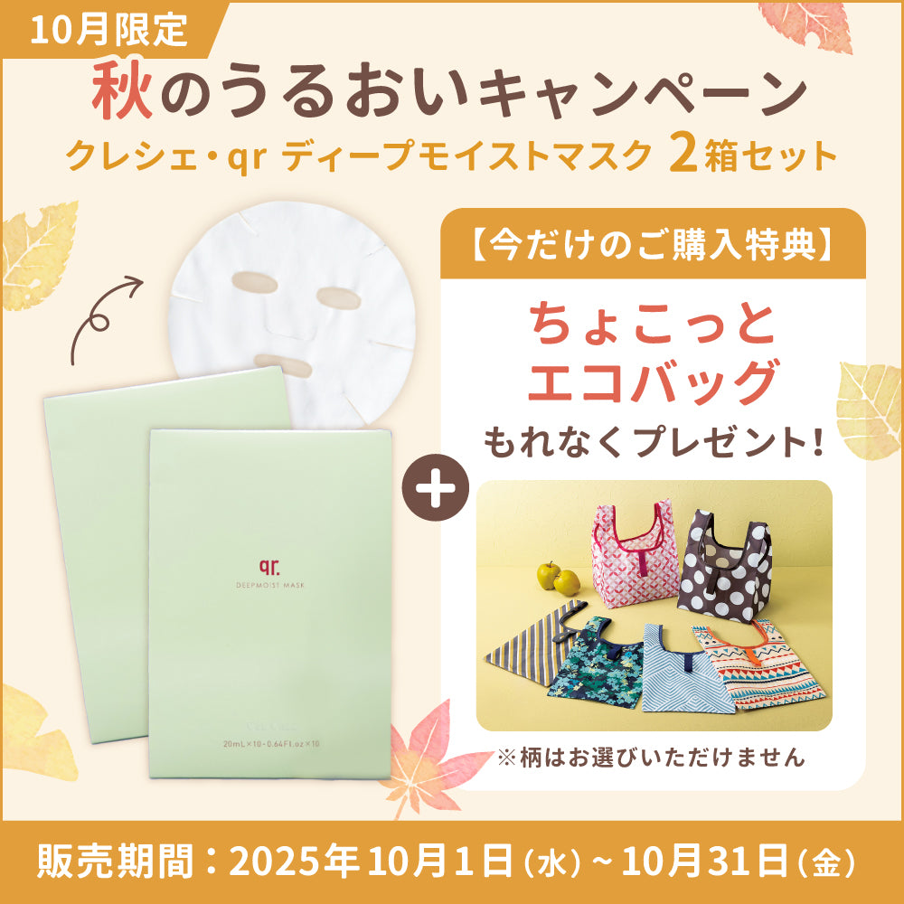 10月31日(金)までの期間限定で、クレシェ・qr ディープモイストマスク2箱セットをお買い上げで、もれなく「エニコ/ちょこっとエコバッグ」をプレゼント!