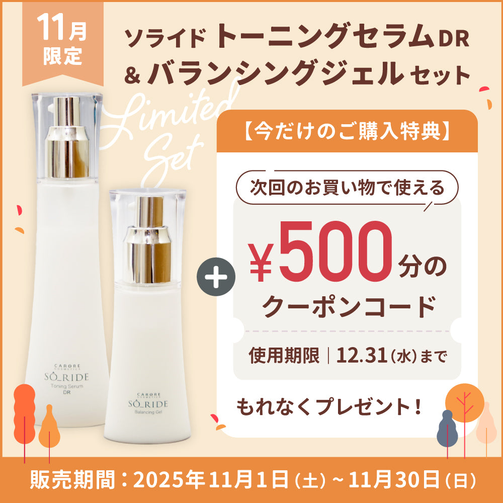 11月30日(日)までの期間限定で、ソライド トーニングセラムDR&バランシングジェルセットをお買い上げいただくと、次回のお買い物に使える500円分のクーポンコードをプレゼント!