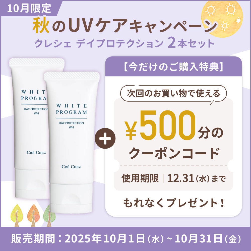 10月31日(金)までの期間限定で、クレシェホワイト デイプロテクションWH 2本セットをお買い上げいただくと、次回のお買い物に使える500円分のクーポンコードをプレゼント!