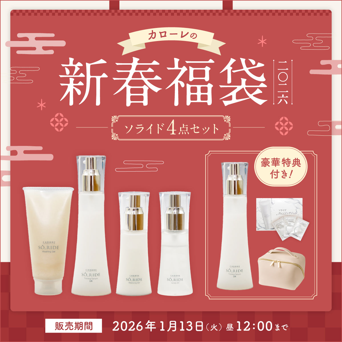ソライド ウォッシングジェル、トーニングセラムDR、バランシングジェル、ケアリーエクスを各1本ずつ、計4点セットのお得な福袋でお届け!さらに、トーニングセラムDRとクレンジングジェル お試しセット(3回分)、オープンポーチがついてくる!